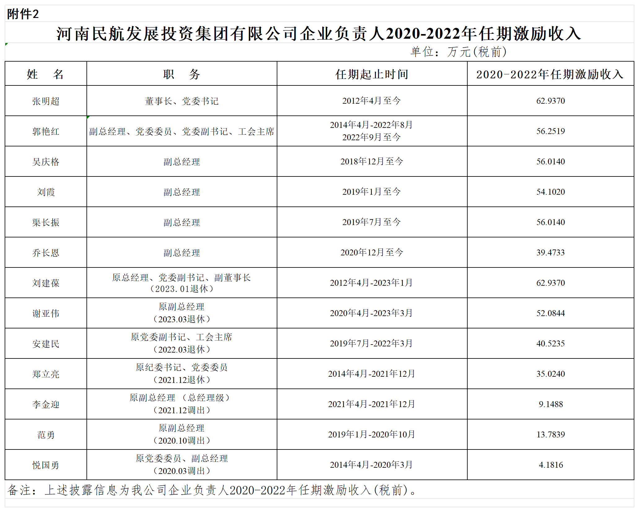 河南民航發(fā)展投資集團有限公司企業(yè)負責人2022年度薪酬及2020-2022年任期激勵收入情況
