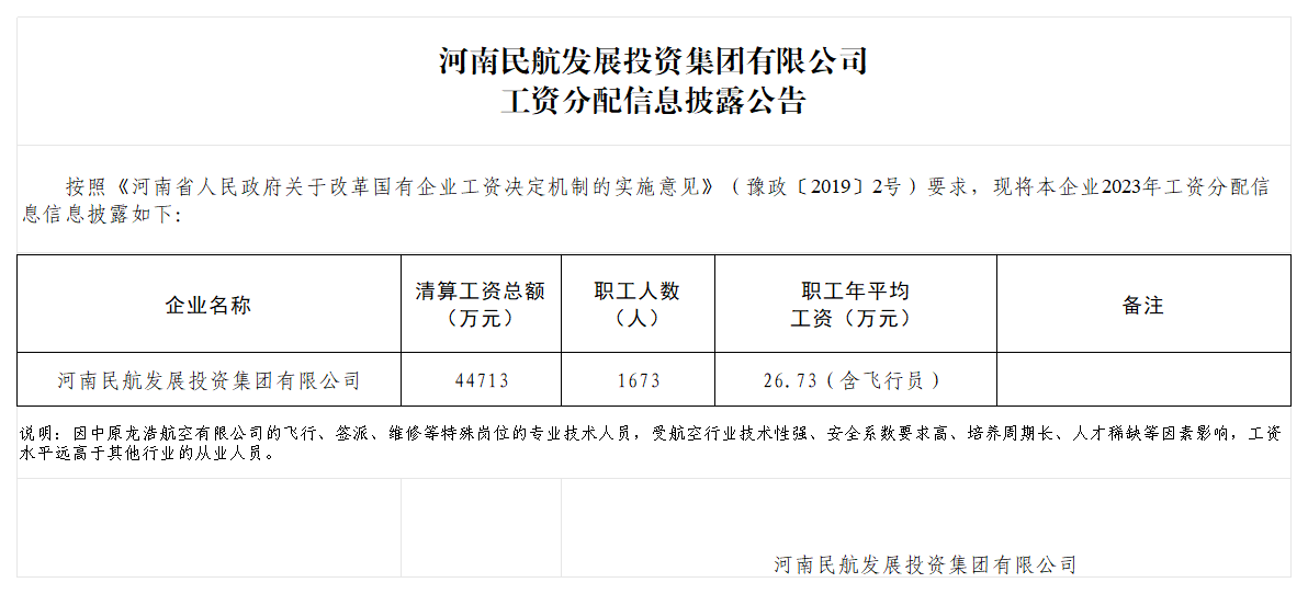 河南民航發(fā)展投資集團(tuán)有限公司2023年度工資分配信息披露