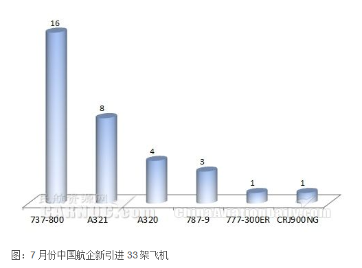 根據(jù)民航數(shù)據(jù)分析系統(tǒng)CADAS,2016年7月份中國大陸航空公司新引進飛機33架。其中南航引進飛機數(shù)量最多,為6架;機型方面,737-800飛機數(shù)量最多,為16架。