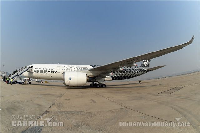 11月2日一架身披碳纖維特殊涂裝的空客A350-900測(cè)試飛機(jī)飛抵北京首都國(guó)際機(jī)場(chǎng),并在11月3日進(jìn)行展示。A350是目前世界上最先進(jìn)的遠(yuǎn)程寬體飛機(jī)。北京是空客A350中國(guó)巡演活動(dòng)的第三站,之前這架生產(chǎn)序列號(hào)為MSN2的測(cè)試飛機(jī)已經(jīng)訪問(wèn)了珠海和???,接下來(lái)它還將飛抵上海、廣州和成都進(jìn)行靜態(tài)和飛行展示。