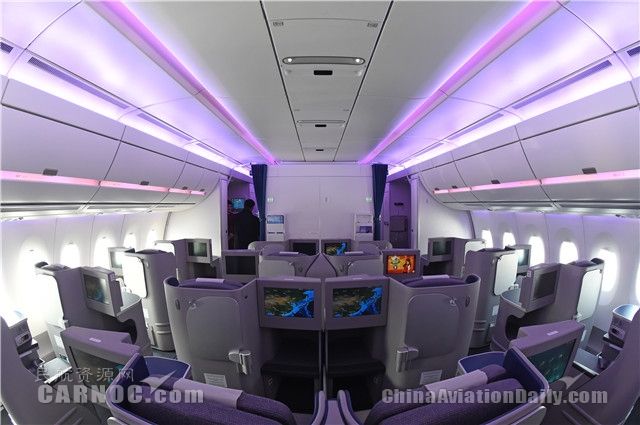 MSN2采用兩級(jí)客艙布局,商務(wù)艙擁有42個(gè)可全平躺的座位,經(jīng)濟(jì)艙擁有210個(gè)座位。A350樹立了最新的乘坐舒適性標(biāo)準(zhǔn),乘客無(wú)論身處哪個(gè)艙位,都可以獲得更大的個(gè)人空間。另外,A350客艙還擁有更大的舷窗、更大的頭頂行李艙,以及最新一代機(jī)上娛樂(lè)系統(tǒng)和空中上網(wǎng)功能。