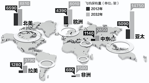 根據(jù)波音公司的預(yù)測,未來20年全球民機市場規(guī)模將翻一番,新興市場成為增長主動力。到2032年,全球?qū)⑿略龀^3.5萬架飛機,總額高達(dá)4.8萬億美元。亞太市場增幅最大,將新增1.282萬架飛機,總額1.89萬億美元。其中,中國市場發(fā)展最為迅速??湛凸究偛眉媸紫瘓?zhí)行官密法布里斯·布利葉認(rèn)為,中國航空業(yè)的迅速發(fā)展是中國經(jīng)濟社會發(fā)展的必然產(chǎn)物,中國航空業(yè)發(fā)展的年均增速約為10%,同期全球航空業(yè)的增速則為5%。在未來20年,中國將成為世界最大的航空市場。