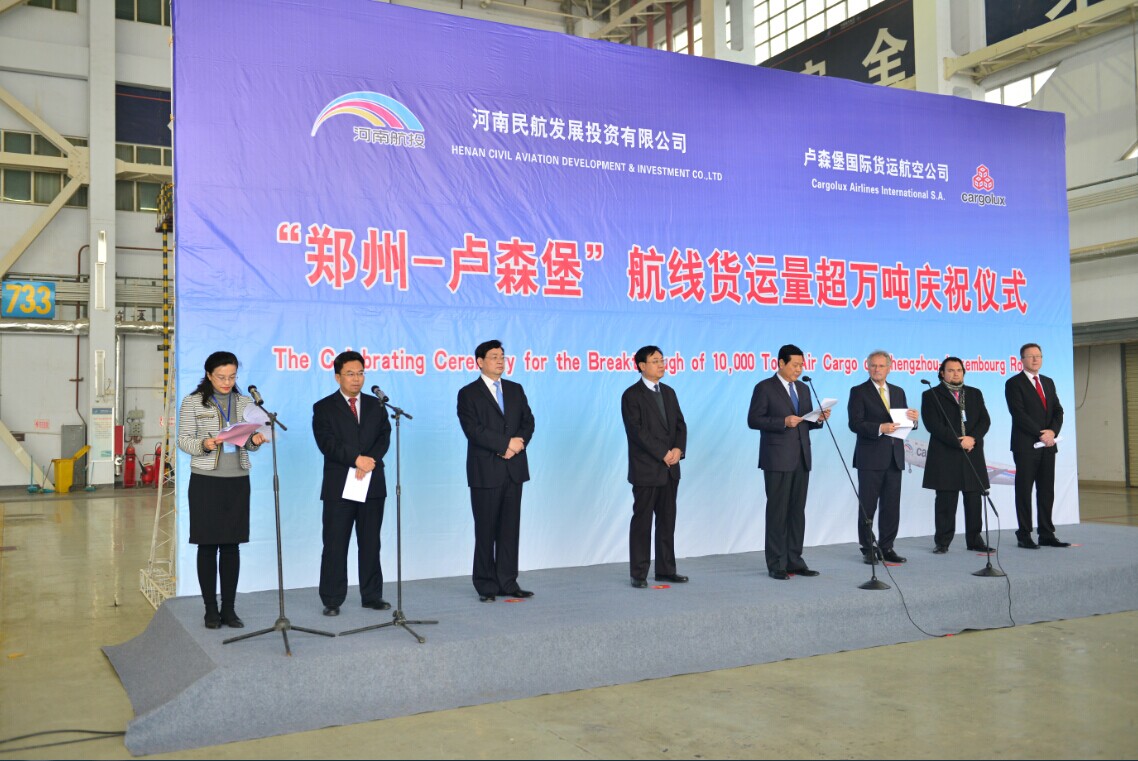 河南省副省長趙建才參加儀式并致辭,他指出,“鄭州-盧森堡”國際貨運航線架起了橫貫中歐大陸的“空中絲綢之路”?!耙宦凤w跨中歐,天塹變通途”,截至今日,該航線累計貨運量已突破萬噸,為鄭州國際機場貨運量的快速提升作出了突出貢獻!這一成績的取得,是河南省與盧貨航優(yōu)勢互補、合作共贏的成功典范,更是“雙樞紐”戰(zhàn)略推動實驗區(qū)發(fā)展的生動實踐。當前,鄭州航空港經(jīng)濟綜合實驗區(qū)發(fā)展態(tài)勢良好,希望盧貨航與河南航投搶抓實驗區(qū)戰(zhàn)略機遇,不斷拓寬合作領(lǐng)域,豐富合作內(nèi)容,加快推動合資貨航組建和飛機維修基地建設,積極培育參與國際分工合作新優(yōu)勢,努力促進鄭州與盧森堡乃至歐亞之間的經(jīng)貿(mào)合作和人文交流,為建設鄭州航空港經(jīng)濟綜合實驗區(qū)做出新的更大的貢獻。